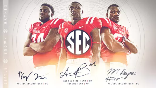 Sophomore wide receiver A.J. Brown was selected as a first team wide receiver, while offensive lineman Greg Little and defensive end Marquis Haynes were voted to the second team. Brown also earned second team honors at the all-purpose position.